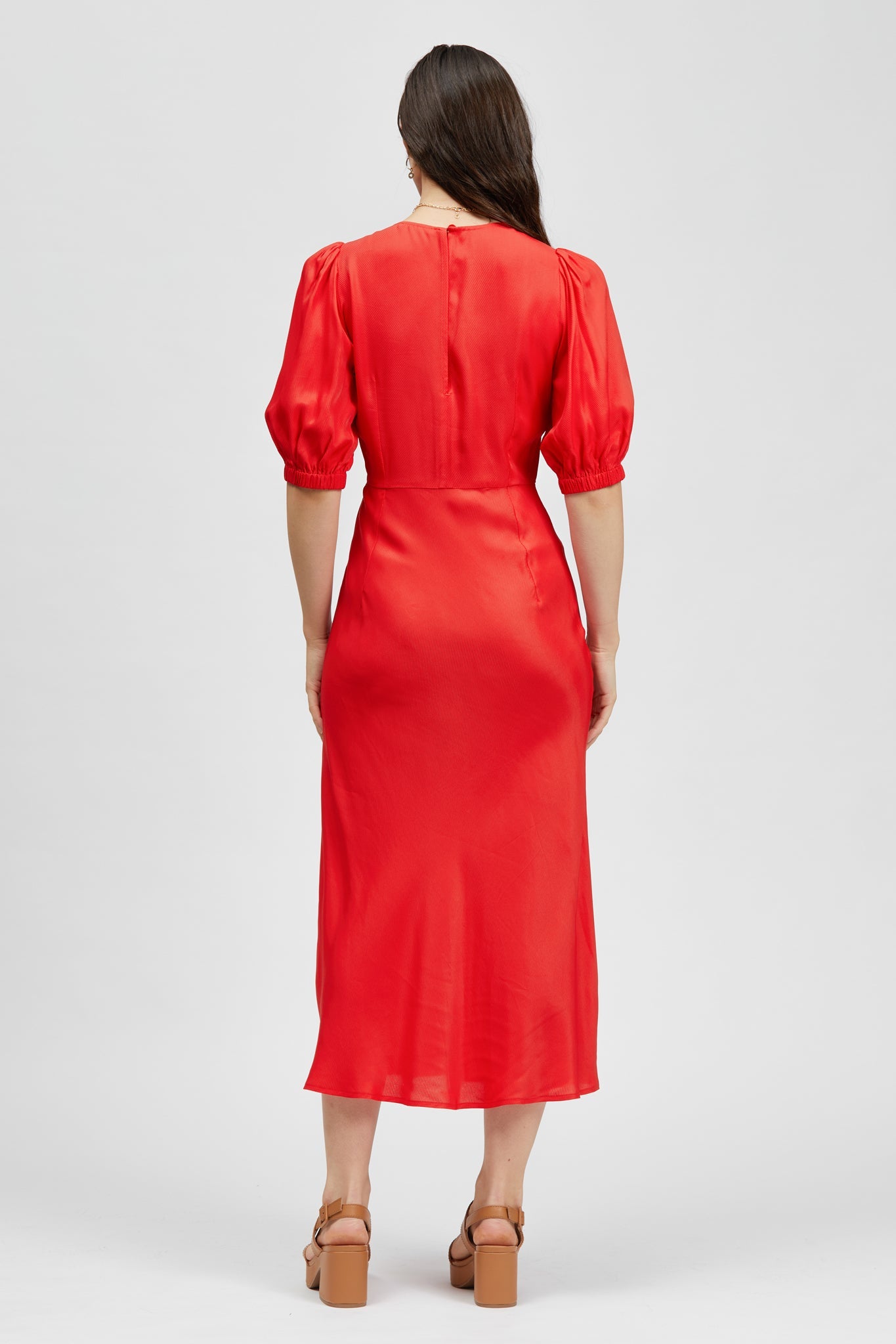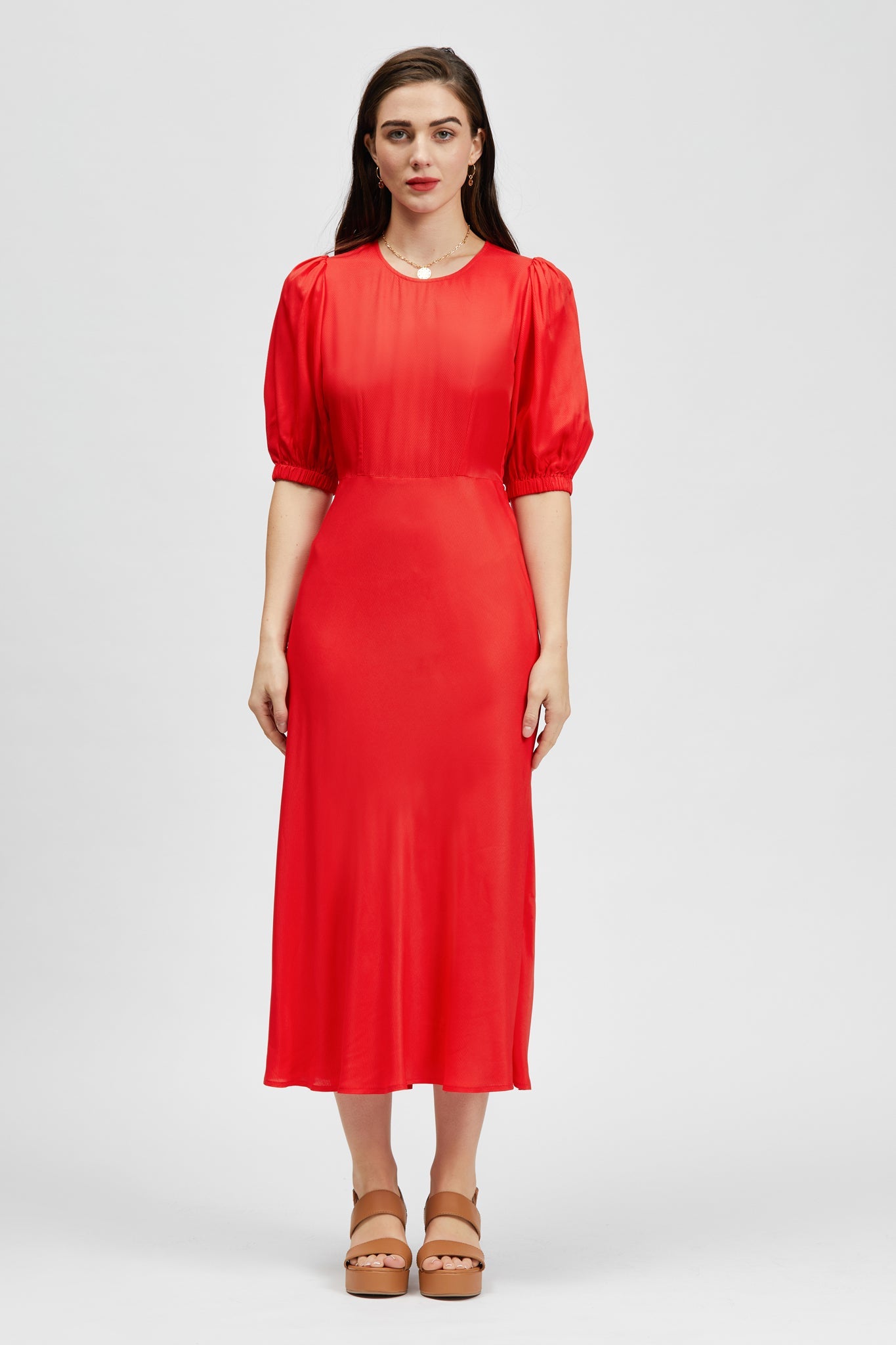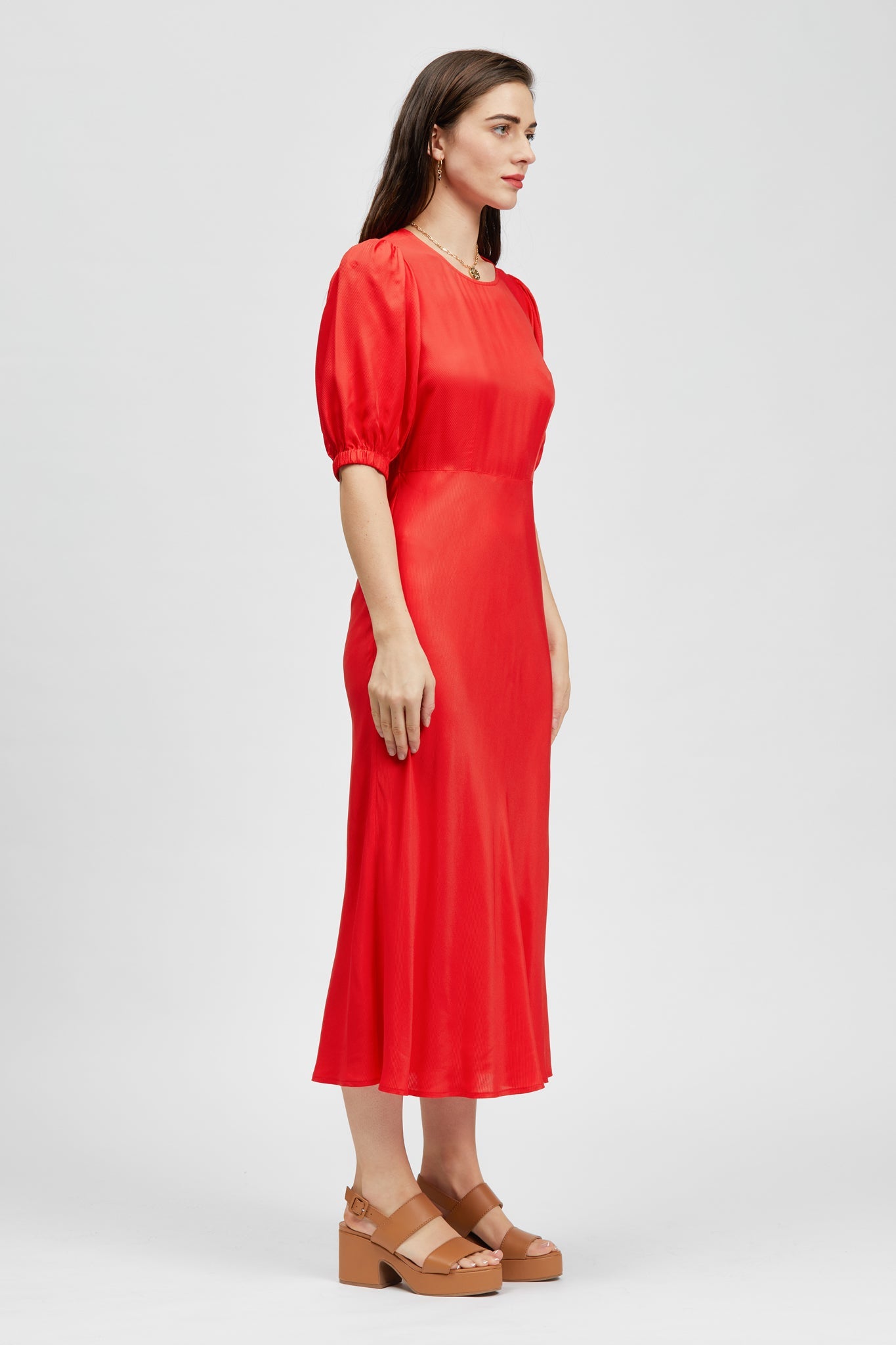 The Leo Midi Dress is an a-line, mid-length style, with a regular fit. This style includes voluminous short sleeves and dart detailing. Made in a flowy viscose fabrication.