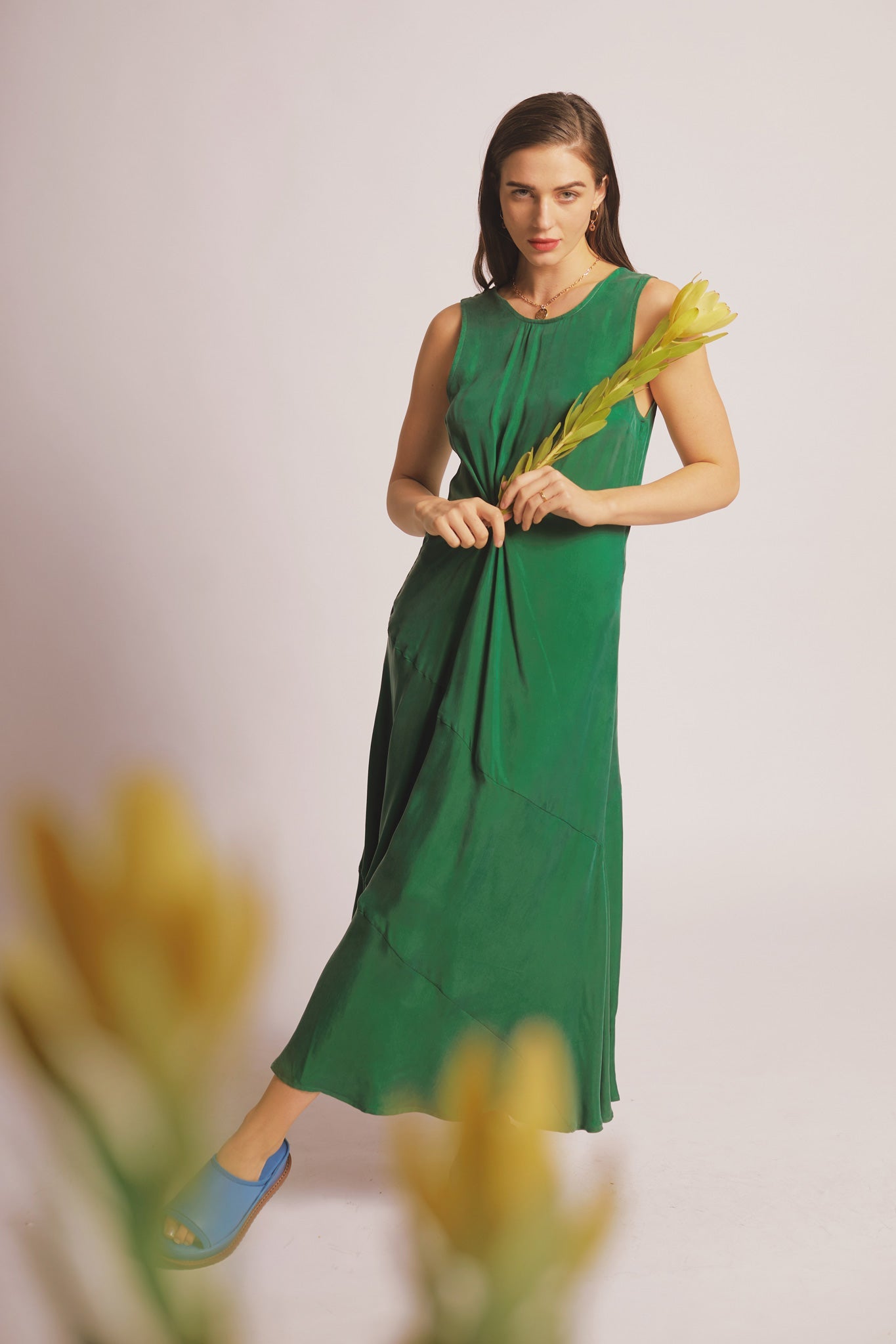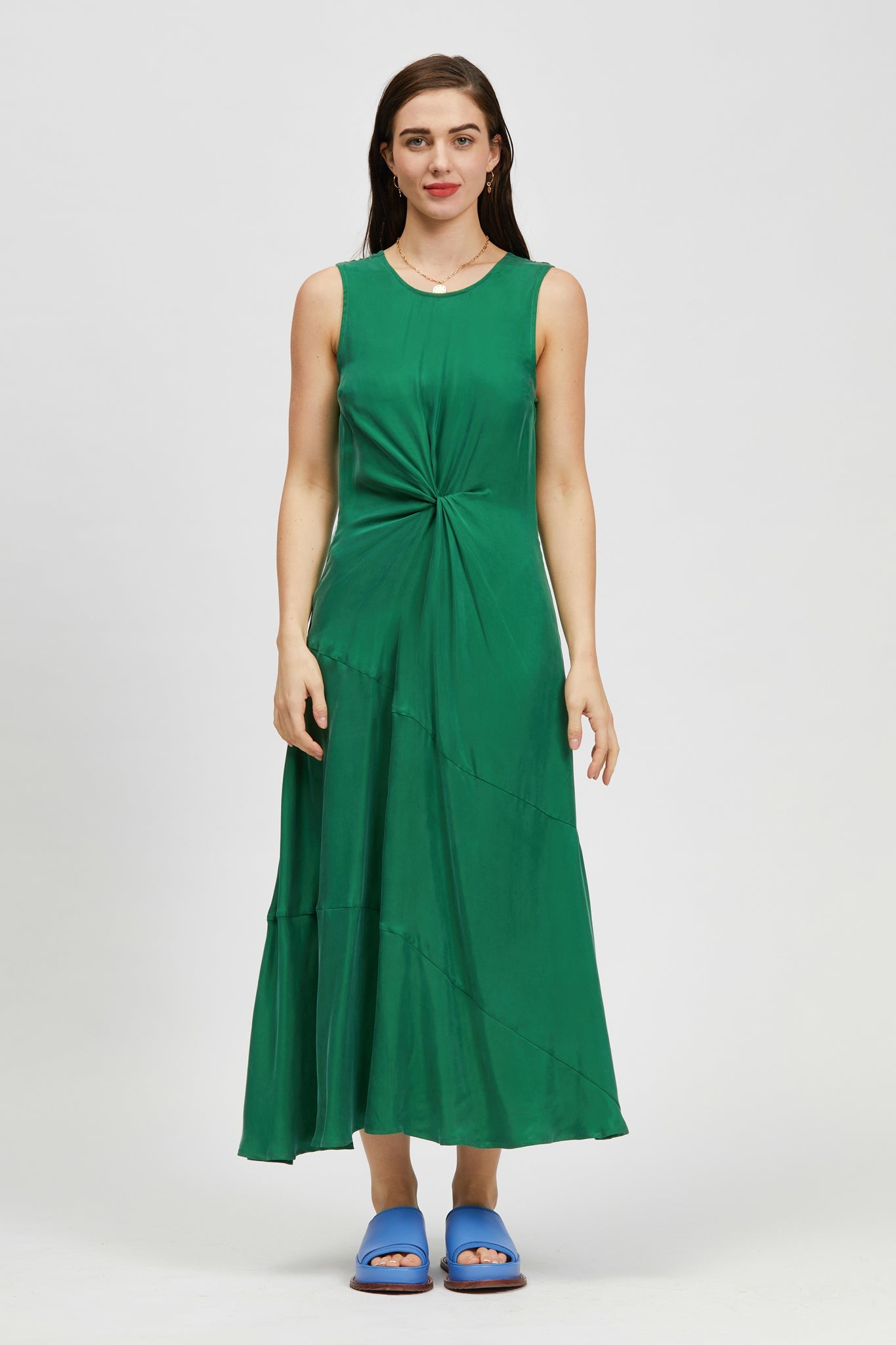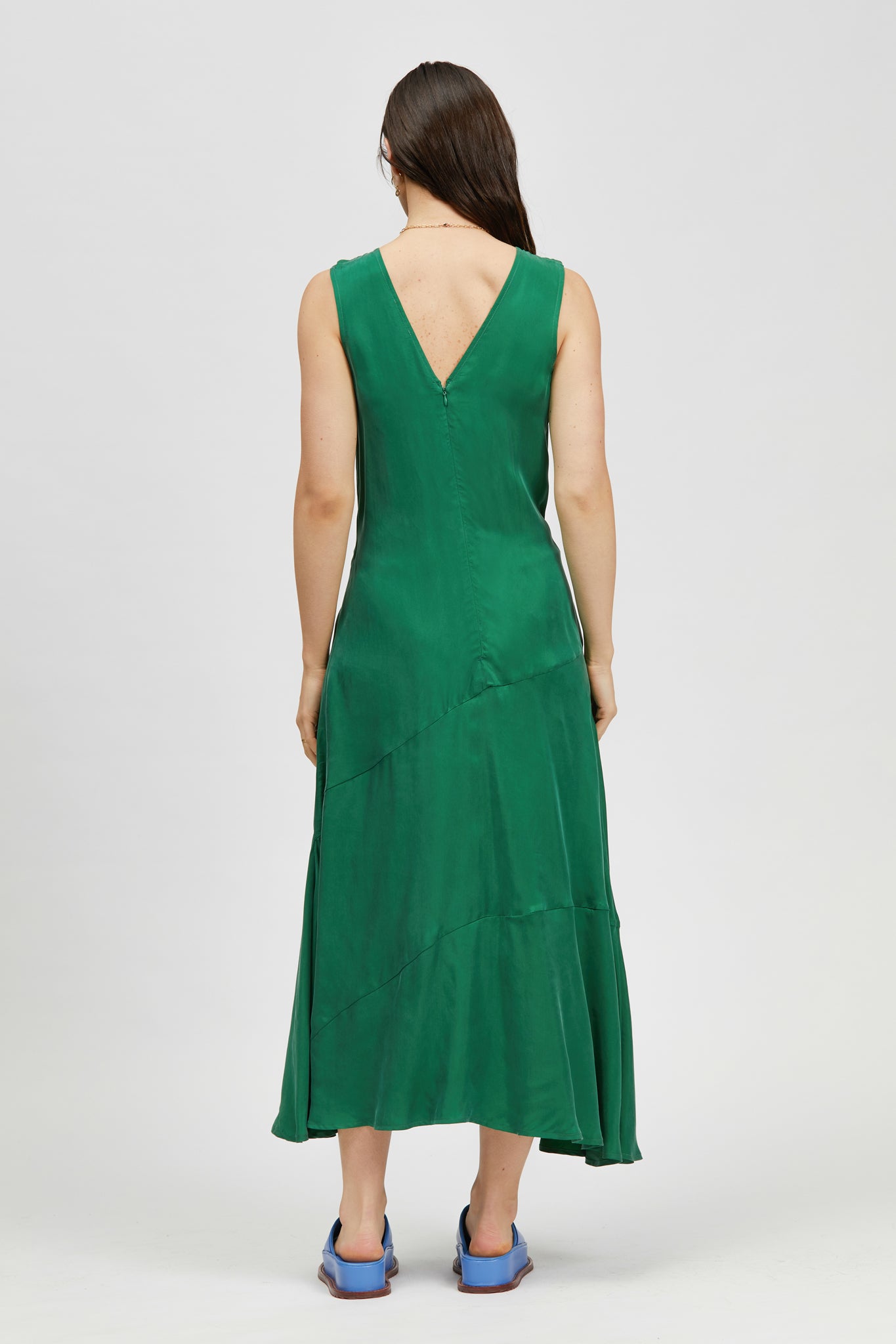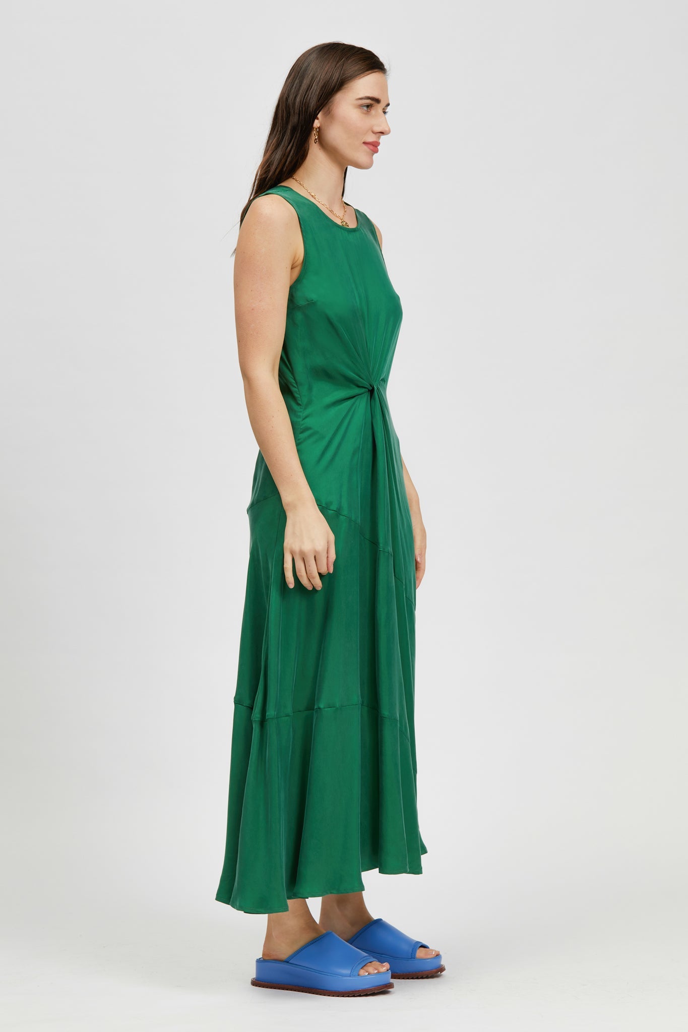 The Sparkes Dress is a sleeveless, mid-length style with a regular fit. This style offers twist waist and asymmetrical seam detailing. Made in a soft cupro blend.